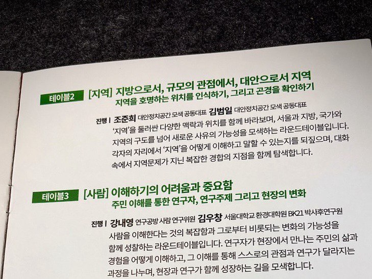모색은 협력단체로서 [지역] 라운드테이블을 운영했습니다. 라운드테이블에서는 서울과 지방으로서의 지역, 국가와 로컬로서의 지역 등 [지역]을 보는 구도를 체감하고 더 넓은 이해의 가능성을 모색하고자 했습니다. 낯선 접근 방식이었음에도 참여자분들의 열린 마음과 부산, 목포, 지리산, 대구와 수도권에 이르기까지 다양한 지역의 이야기로 채웠던 자리! 자세한 이야기와 [지역]에 대한 대안적 시선은 추후 정리 기사 또는 별도 정리글을 통해 공유하겠습니다✍️ ※사진=사단법인 시민 |