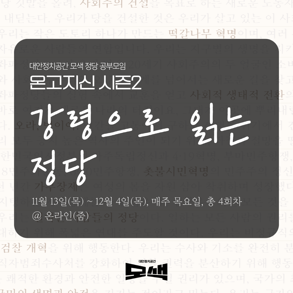 모색에서는 바로 그런 '사람을 모으는 일' 자체에 관한 이야기를 깊이 나눌 수 있어서 좋았는데요. 그동안 연재 기고, 집담회를 통해 이어온 이야기, 다음주엔 문을 더 활짝 열고 오프라인에서 만납니다. 정당, 노동조합, 정치운동 등 각자의 현장에서 각자의 방식으로 사람을 모으고, 힘을 만들어나가고 있는 분들의 생생한 이야기를 듣는 자리로 준비했어요.