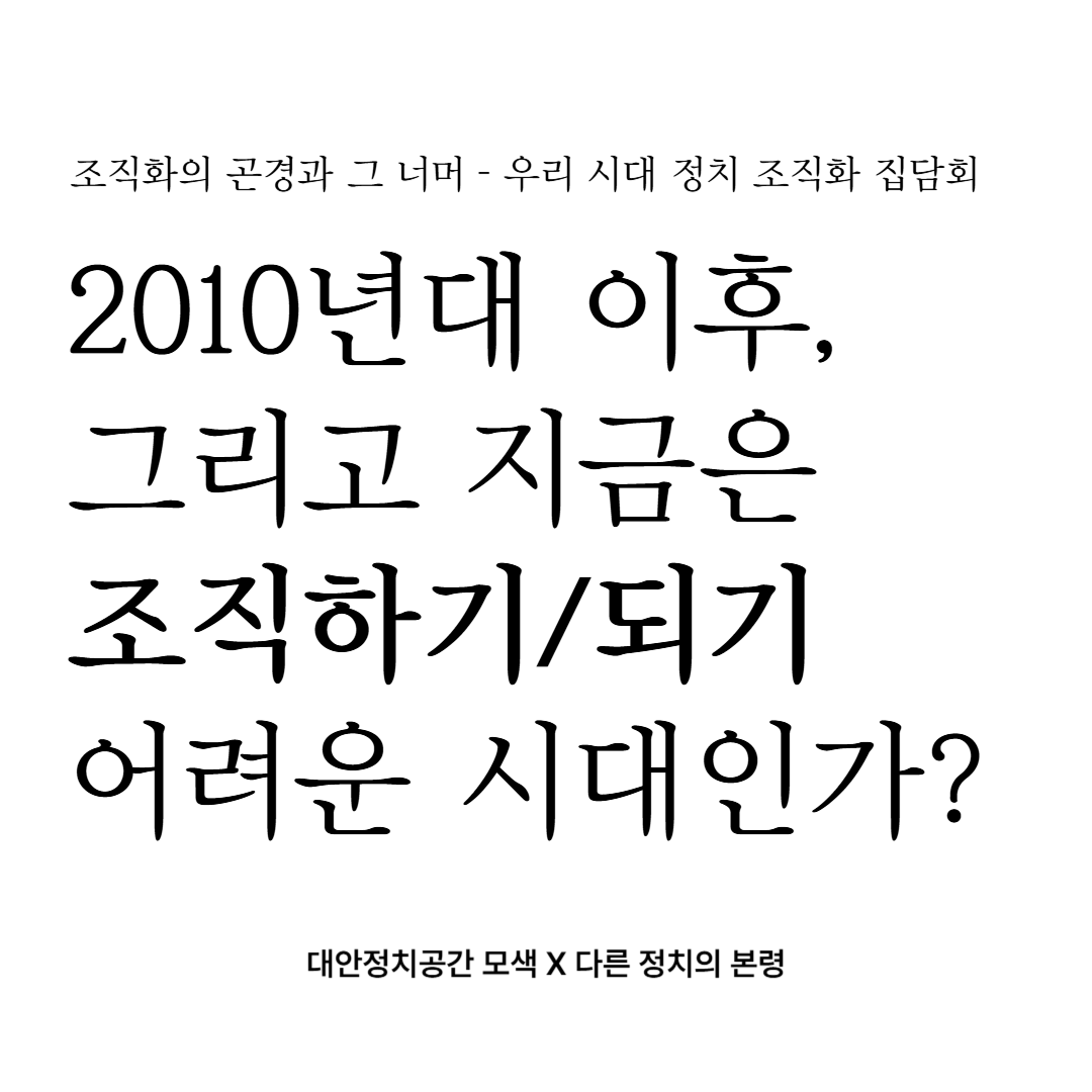 🎙️정치 조직화라는 키워드에 진심인 모색은 다정본(다른정치의본령)과 공동으로 2010년대 이후 정치 조직화에 관한 집담회를 개최했습니다. 이번주까지 총 세 차례의 게시물로 나눠 소개할 예정입니다.